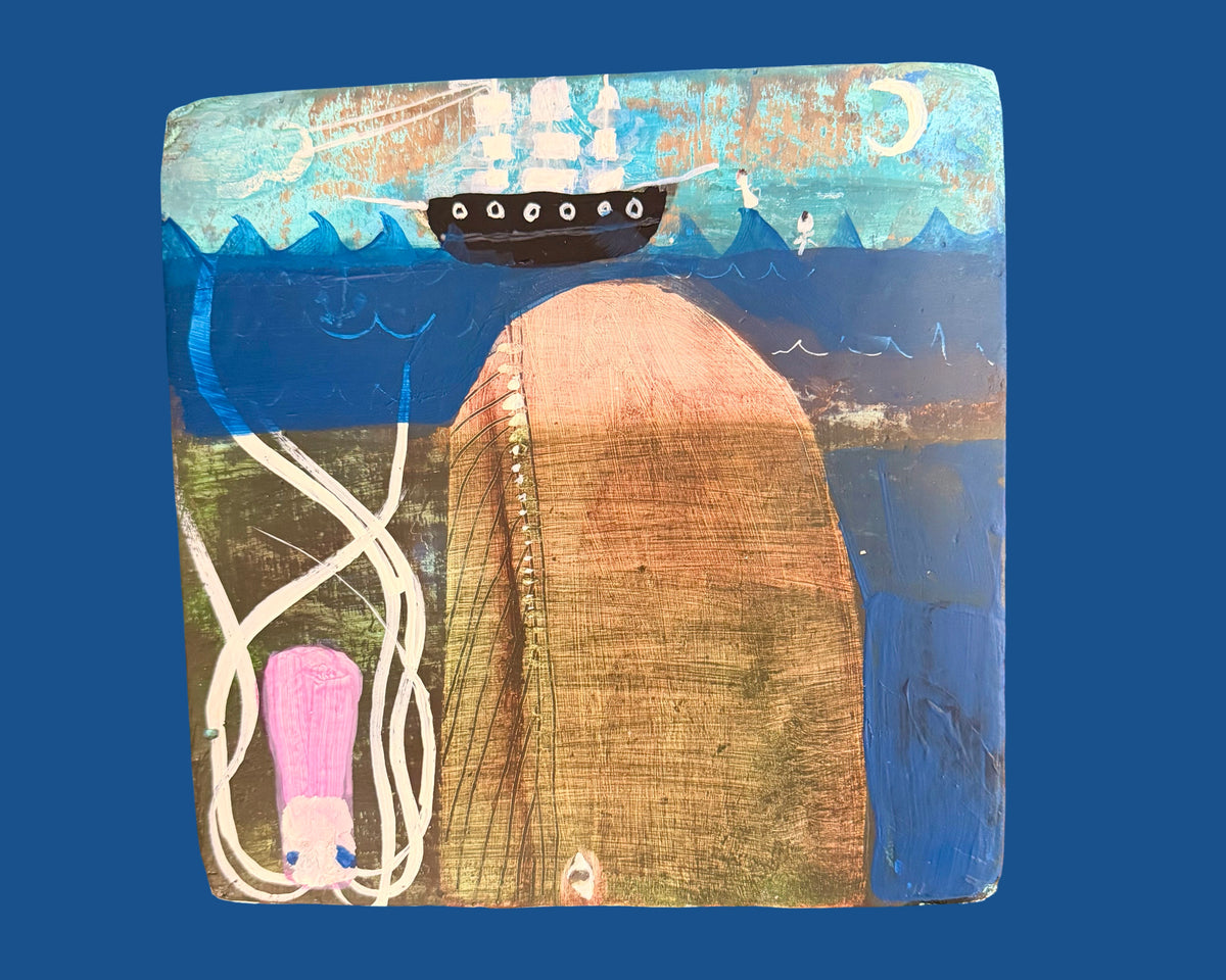 Painted on and old wooden box, sanded back with love. This work can be hung or sit on a shelf or used as a step.