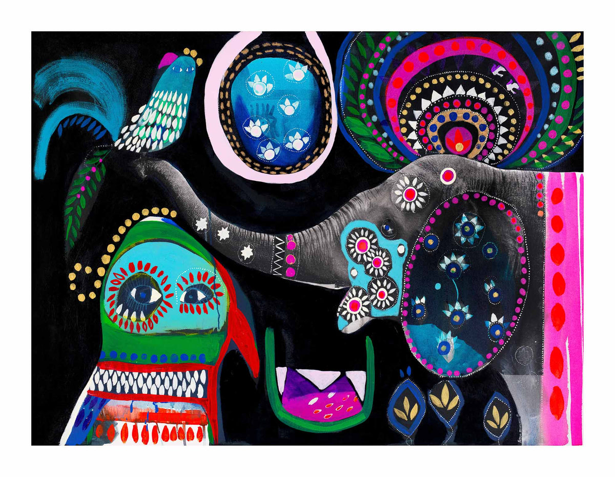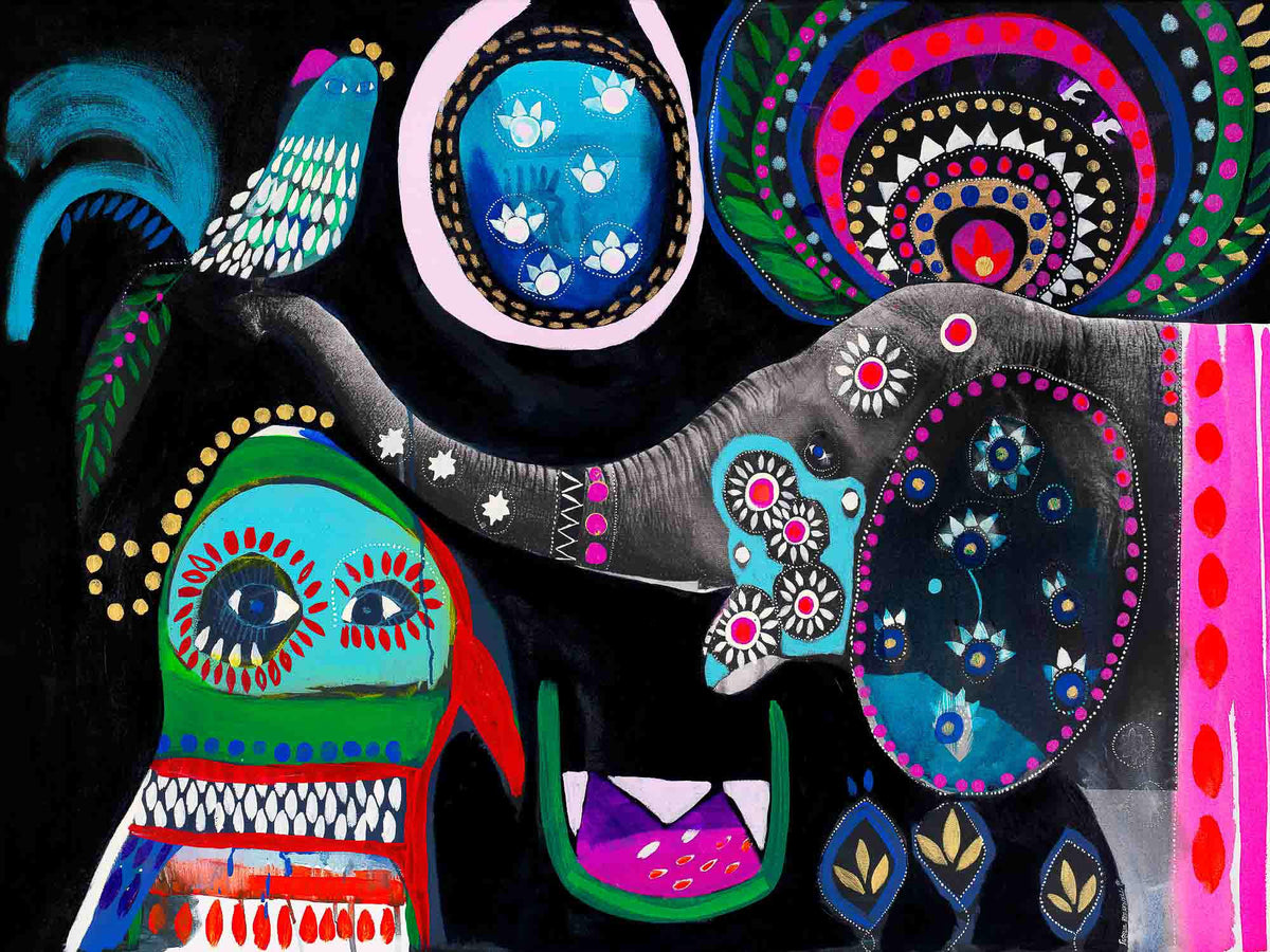 'Percy' is playful. This beautiful elephant on a dark background with bright pops of colour is striking to say the least. It is full of fun and serves a wonderful purpose of putting endless colour into any space.